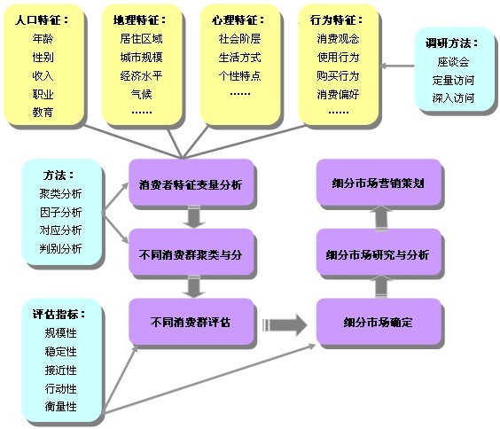 市場細分研究是按照一定的基礎和變數,把整個市場細化成不同的消費者群。每個細分的消費者群內部都具有較高程度的同質性,而與其他的消費者群則存在明顯的差異性。市場細分的目的就是從各個細分的消費者群當中,辨認和確定企業的目標市場,然后針對不同的目標市場采取富有針對性的產品定位和市場營銷戰略,以獲取最佳收益。